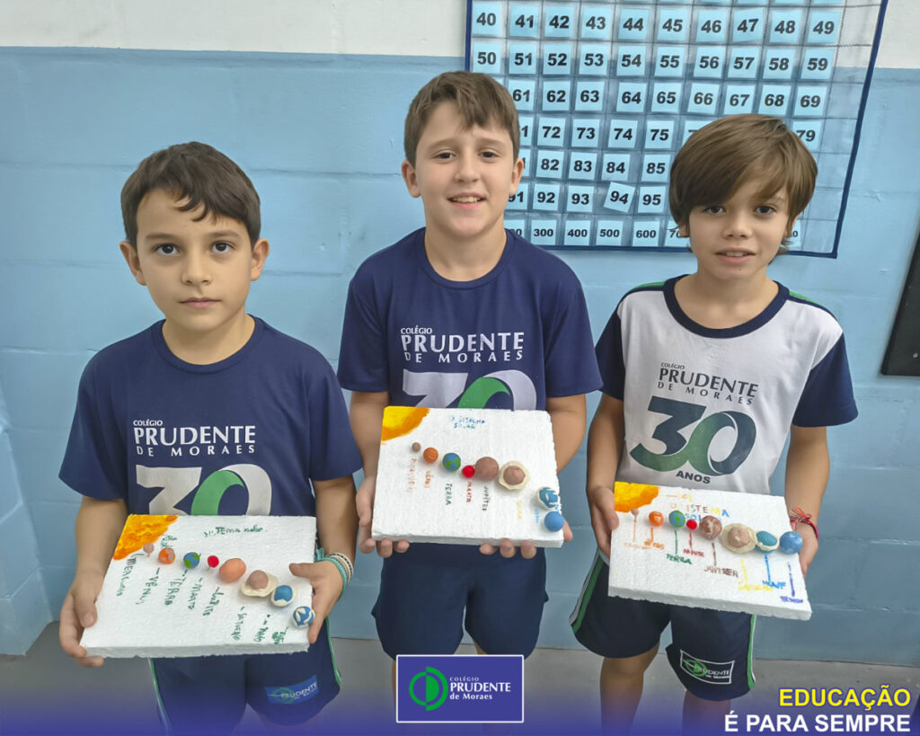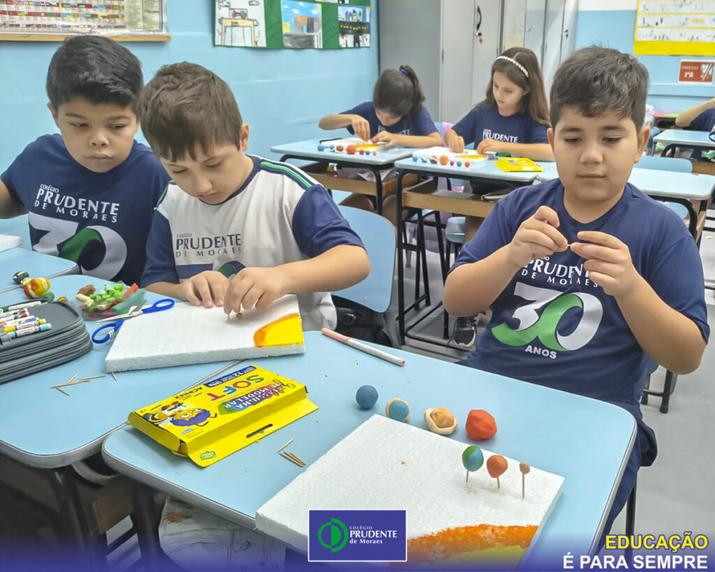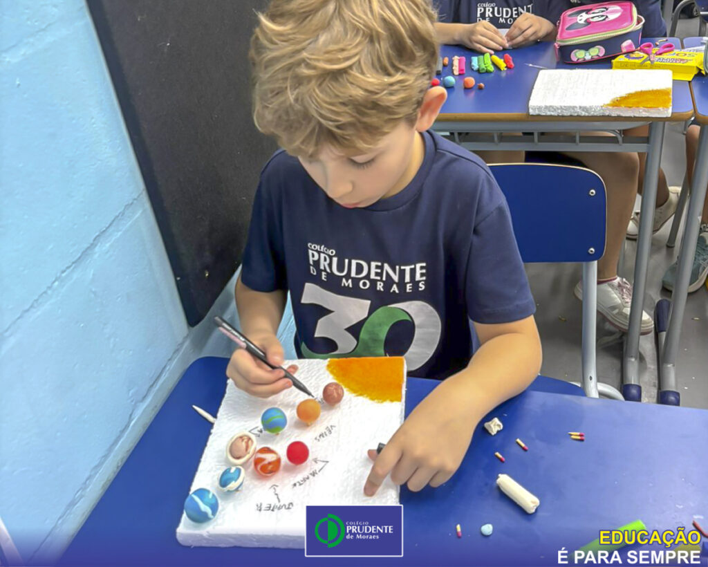 Após aprenderem sobre os planetas, suas características e a importância do Sol, eles colocaram o conhecimento em prática de forma criativa e divertida: cada aluno produziu sua própria maquete utilizando massinha.