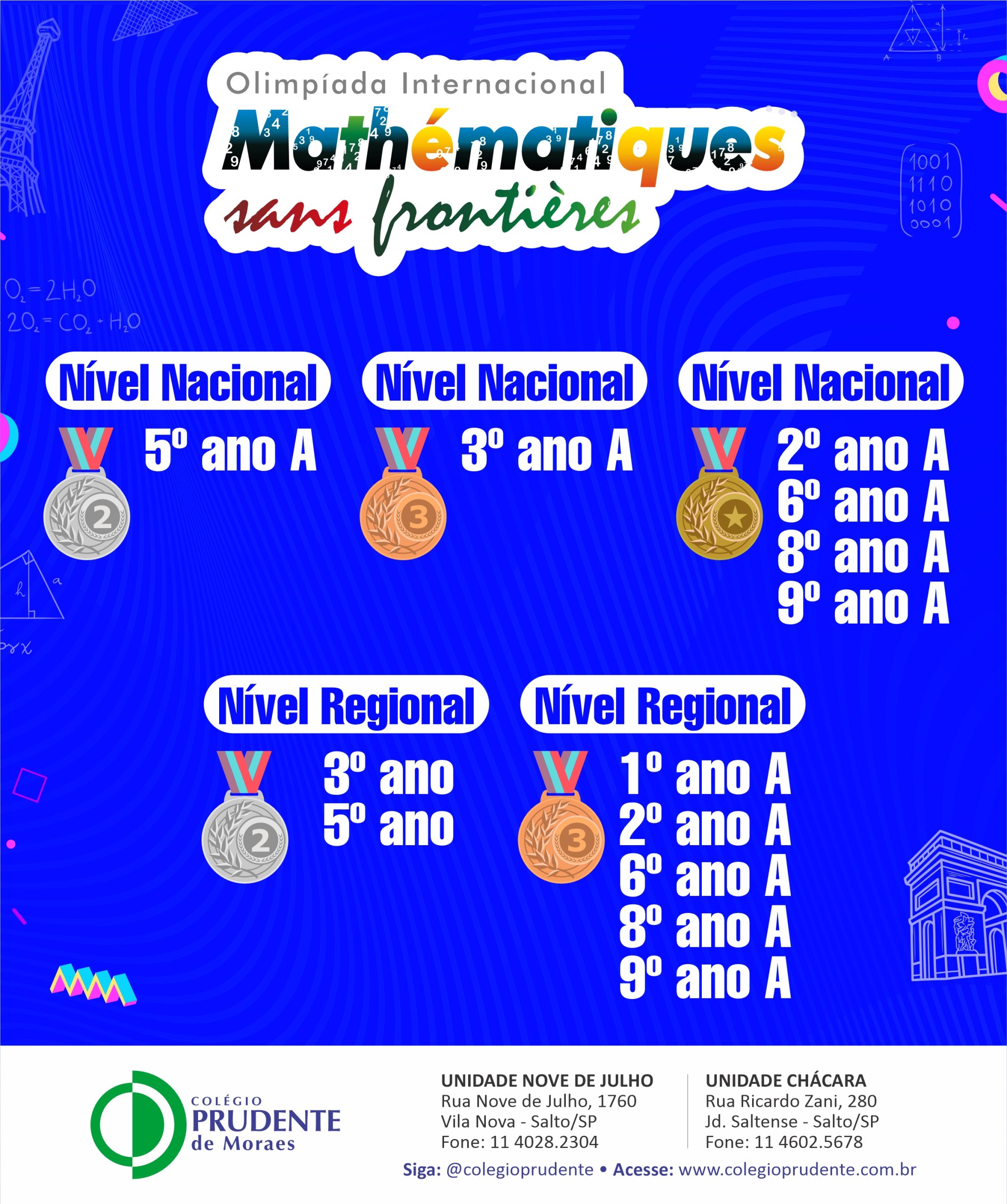 Alunos conquistam Prata e Bronze nos níveis Nacional e Regional Sudeste na Olimpíada Internacional de Matemática sem Fronteiras.